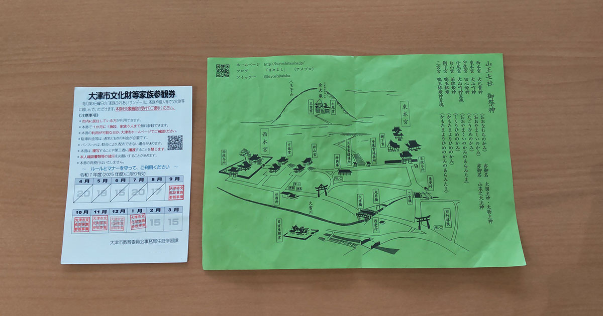 大津市文化財等家族参観券(左)と受付時にもらった緑紙のチラシ(右)。