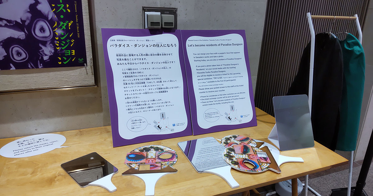 メインの写真は会場の外にある作品です。また会場の外(館内)には3か所にお面(?)と服が用意されています。その服やお面を使っての変身写真を写真をSNSに投稿すると次回の企画展のチケットがもらえるらしいです(先着50名様)。詳しくは実際行って説明をご確認ください。