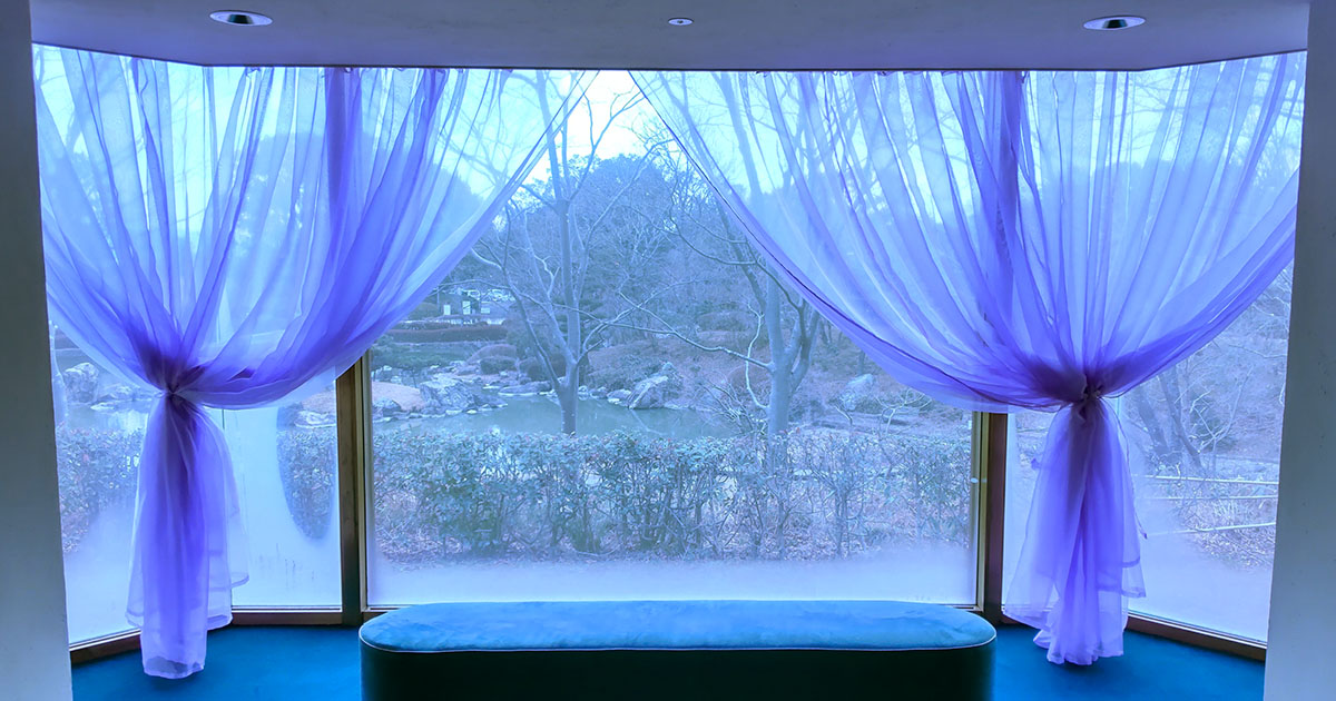 通路もカラーライトが使われていて雰囲気あります。緑っぽいライトのところもあったのですが、撮影禁止エリアだったので赤っぽいのだけになりました。途中にあるソファの休憩所には薄紫のカーテンがかかってました。中が暖かいせいか庭園がかすんで見えててなんかいい感じでした。