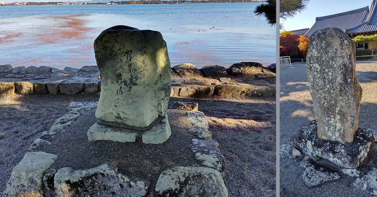 ①芭蕉の句碑が二つありました。左のが「鎖(じょう)あけて月さし入れよ浮御堂」で、右のが「比良山上雪さしわたせ鶯の橋」。左の石はなんか緑っぽくてくねくねしてましたw