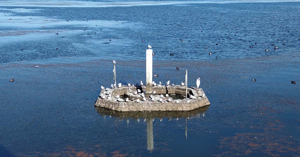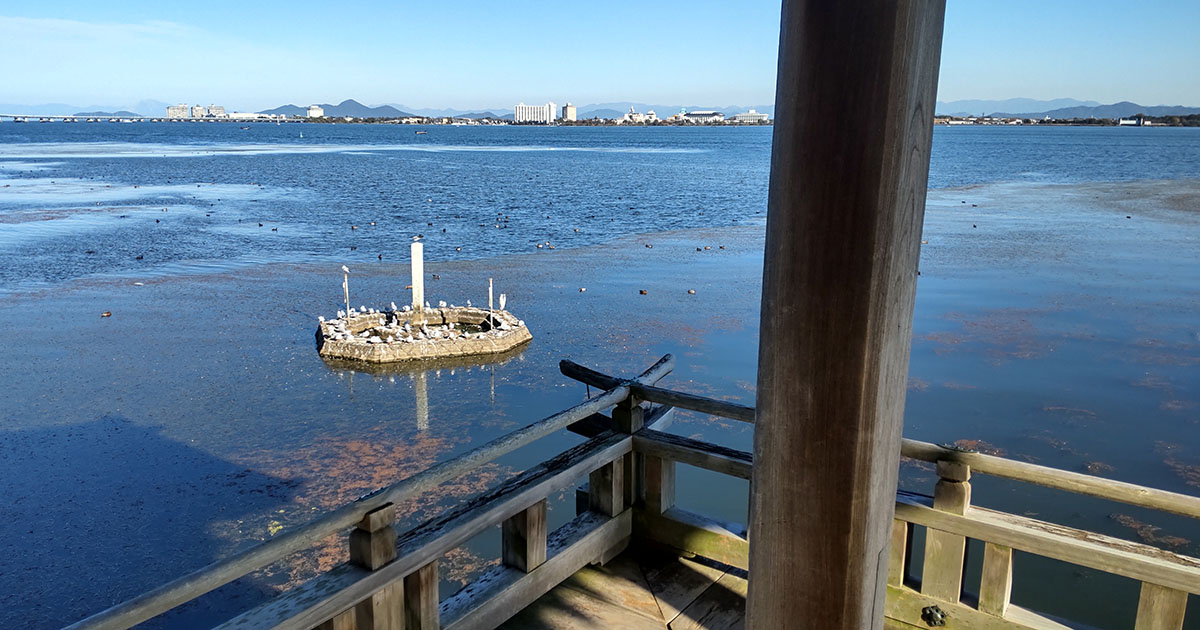 家に帰って調べるまで、鳥の餌場か休憩所かと思っていた「高浜虚子の湖中句碑」です。言い訳すると句碑が白く反射していて何か書いてあることもわかりませんでした😅 「湖も この辺にして 鳥渡る」と書いてあるそうです。雁じゃなくてゆりかもめ(だと思う)に占拠されているっぽいw(…と思ってたんだけど、上のアップ目の写真をよく見たら白くて大きい鳥が1羽だけ紛れてましたww)